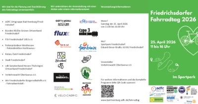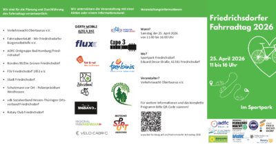 Am 25. April 2026 findet auf dem Gelände des Sportparks Friedrichsdorf wieder der Friedrichsdorfer Fahrradtag statt. Nach der erfolgreichen Premiere im letzten Jahr präsentieren sich auch in diesem Jahr in der Zeit von 11:00 bis 16:00 Uhr Vereine und Initiativen mit Angeboten rund um das Fahrrad dem interessierten Publikum. Highlight der Veranstaltung wird erneut die Fahrradbörse des Vereins "Wir Friedrichsdorfer Fahrradwerkstatt" sein.