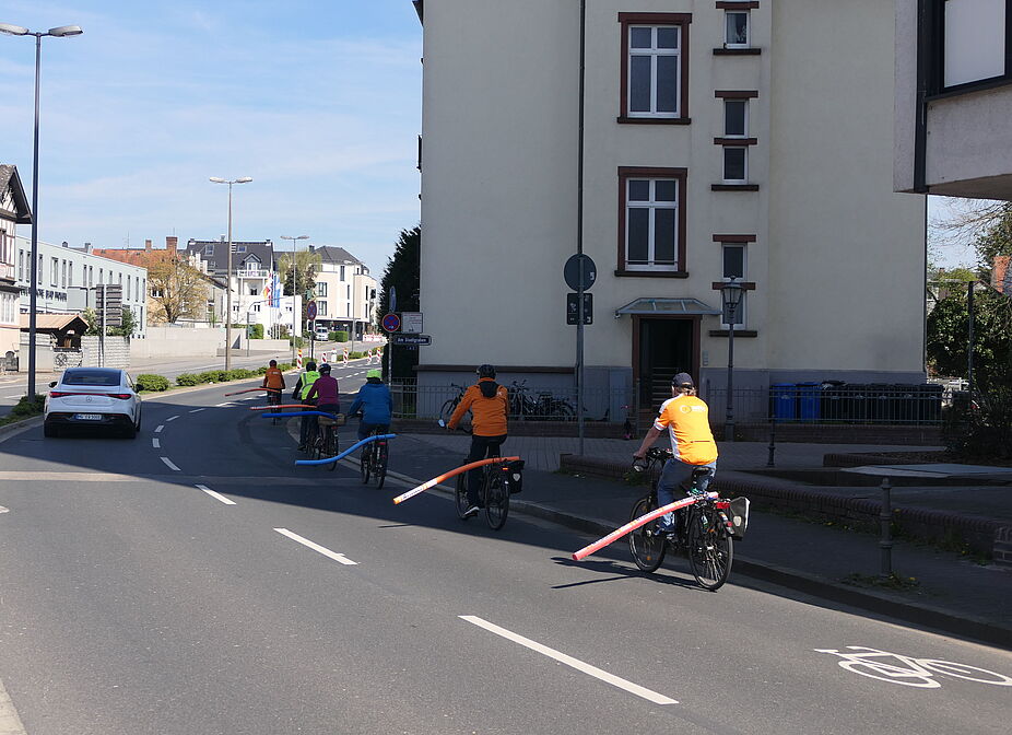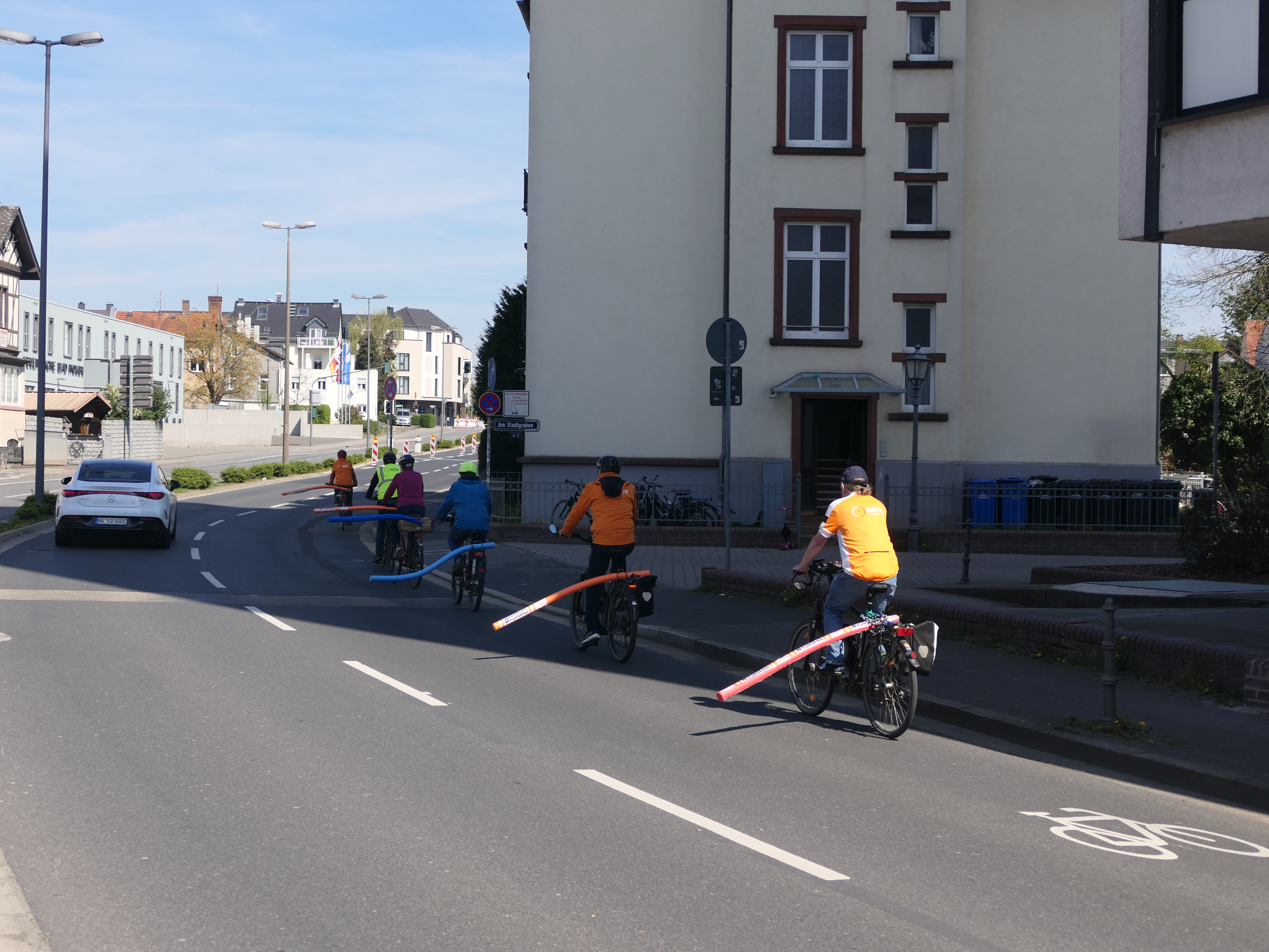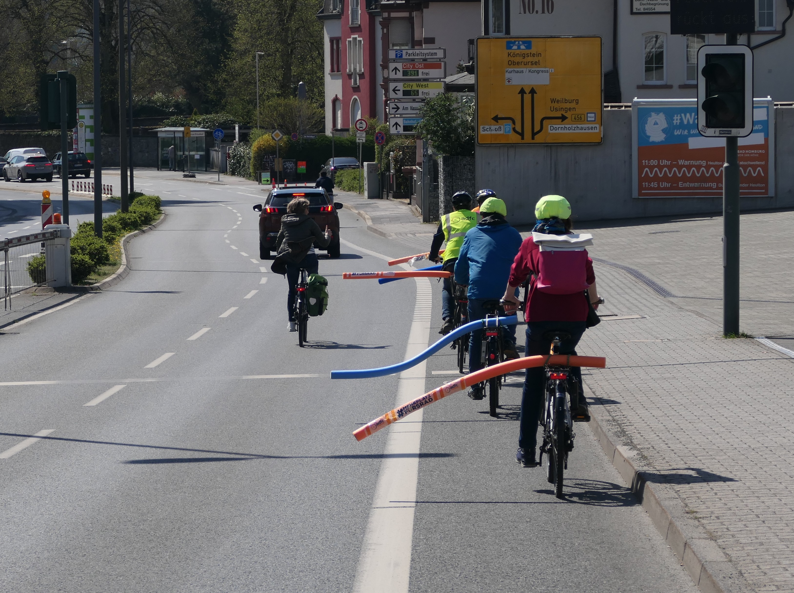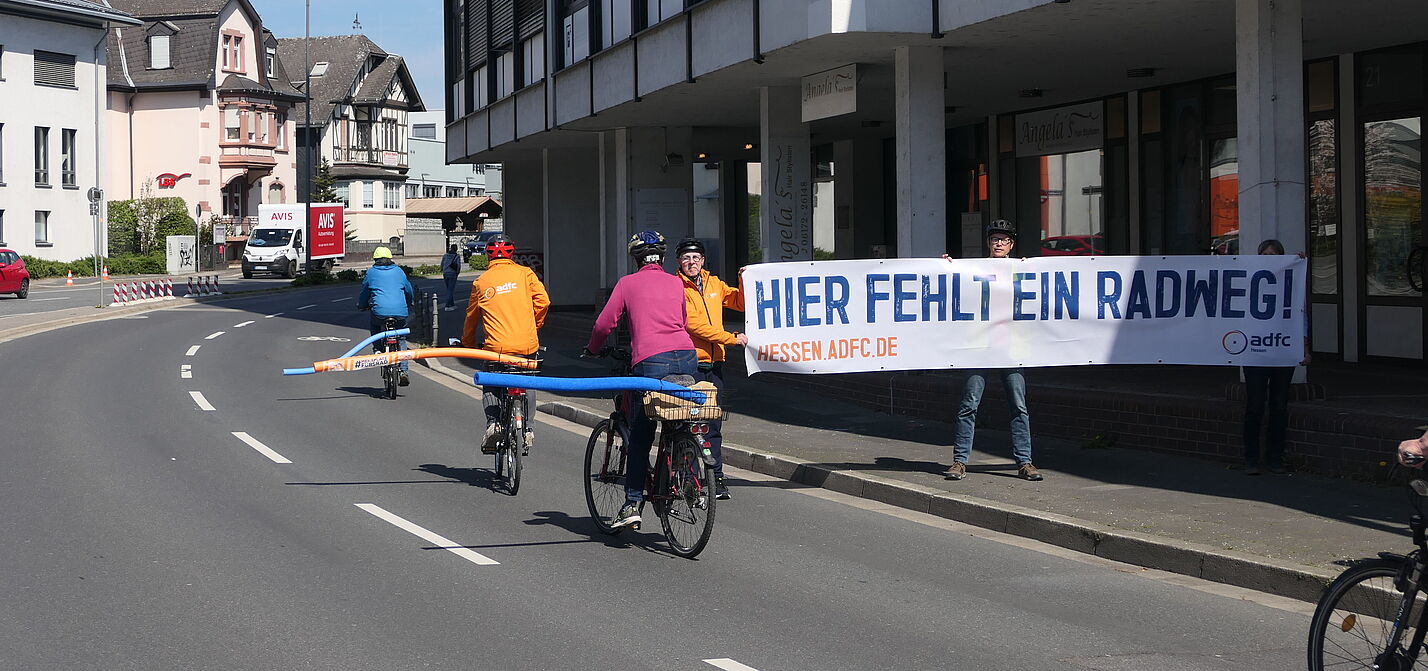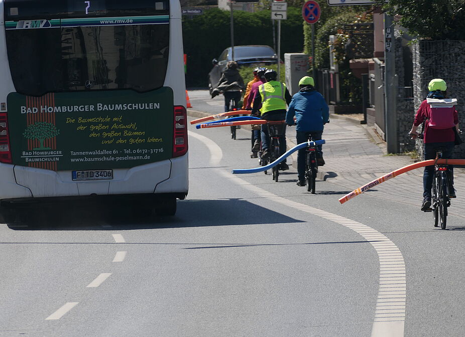 Der Allgemeine Deutsche Fahrrad-Club (ADFC) hat bei einer Fahrt auf beiden Seiten der Dietigheimer Straße gezeigt, welchen Platz ein Fahrrad benötigt. Dazu hatten die Radfahrenden Schwimmnudeln mit einer Länge von 1,6 m an ihren Rädern befestigt und fuhren damit zunächst vom Untertor in Richtung Höhestraße. Mit einem Banner machte der ADFC hier darauf aufmerksam, dass auf dieser Straße ein Radweg fehlt, nachdem der ohnehin viel zu schmale Radfahrstreifen von der Stadt Bad Homburg entfernt wurde. Ralf Gandenberger, Vorsitzender der Ortsgruppe Bad Homburg/Friedrichsdorf des ADFC, hebt hervor, dass Kraftfahrzeuge nach der Straßenverkehrsordnung damit einen Überholabstand von 1,5 Metern zu Radfahrenden einzuhalten haben. Sollte dies nicht möglich sein, gilt rechtlich ein Überholverbot! Obwohl der äußere Rand der Nudel den einzuhaltenden Abstand noch nicht ausreichend wiedergibt, zeigen die Bilder deutlich, dass ein Überholen von Radfahrenden nur mit einem Spurwechsel durch die Auto fahrenden möglich ist. Jochen Salow vom Vorstand der Ortsgruppe erläutert dazu: „Der Überholabstand wird vom äußeren linken Rand des Rads gemessen, was meistens das Ende des Lenkers oder eines Spiegels ist. Die Nudel ist aber am Gepäckträger befestigt und steht damit ca. 60 cm weniger heraus, als der Überholabstand sein muss.“